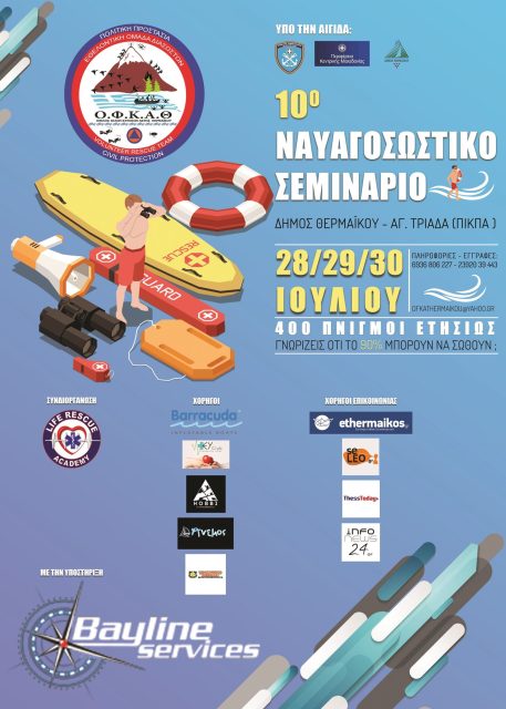 Ο Ο.Φ.Κ.Α.Θ σε συνεργασία με την BAYLINE SERVICES Ναυαγοσωστική Ακαδημία Ελλάδος διοργανώνουν το 10ο Ναυαγοσωστικό σεμινάριο στις 28/29/30 Ιουλίου στην Αγία Τριάδα (περιοχή Πίκπα) του Δήμου Θερμαϊκού