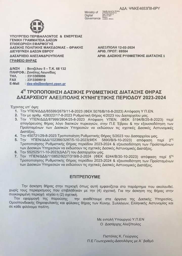 Στην 5η τροποποίηση της Ρυθμιστικής Απόφασης θήρας για την κυνηγετική περίοδο 2023-2024 προχώρησε ο Υπουργός Περιβάλλοντος και Ενέργειας, μετά από σχετική εισήγηση του Δασαρχείου Αλεξανδρούπολης. Μια ακόμα Ρυθμιστική απόφαση που δείχνει κοροϊδία στους Εβρίτες κυνηγούς, αφού επιτρέπει το κυνήγι στο Δέλτα του Έβρου στην μισή του περιοχή και την στιγμή που λήγει το κυνήγι της πάπιας, το οποίο είναι και το κύριο θήραμα στον Έβρο!
