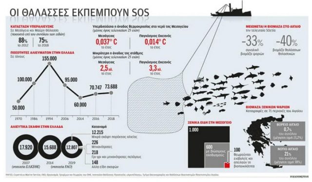 Η πίεση που δέχονται οι πληθυσμοί των ψαριών στο Αιγαίο και στη Μεσόγειο είναι πολύπλευρη. «Υπάρχει η ρύπανση των θαλασσών, όχι μόνο η χημική αλλά και το πλαστικό. Ταυτόχρονα, η κλιματική αλλαγή προκαλεί αύξηση της θερμοκρασίας των νερών. Πολλά είδη βρίσκονται σε συνθήκες που υπερβαίνουν τα όρια αντοχής τους. Για παράδειγμα, στη Λεβαντίνη ο εδώδιμος αχινός δεν υπάρχει πια. Πρόκειται για εικόνες από το μέλλον, θα έχουμε εξαφάνιση ειδών», προειδοποιεί ο κ. Κατσανεβάκης.