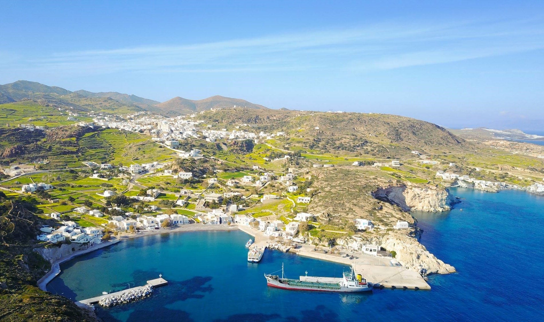 Το ταξίδι στο νησί της κιμωλίας με το πλοίο της γραμμής πιάνει στο μικρό λιμάνι, Ψάθη. Είναι ένας γραφικός οικισμός με ταβερνάκια, ένα-δυό μπαράκια και παραδοσιακό φούρνο. Ο δρόμος, ασφάλτινος και ανηφορικός, οδηγεί σε 1,5 χλμ στη Χώρα ή Χωριό, όπως ονομάζουν οι ντόπιοι την πρωτεύουσα του νησιού τους.