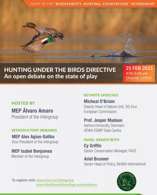 To σεμινάριο θα πραγματοποιηθεί στις 25 Φεβρουαρίου 2021 (16: 00-18: 00), και διοργανώνεται σε συνεργασία με την Ευρωπαϊκή Ομοσπονδία για το Κυνήγι και τη Διατήρηση (FACE).