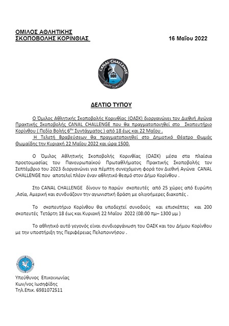 Ο Όμιλος Αθλητικής Σκοποβολής Κορινθίας (ΟΑΣΚ) διοργανώνει τον Διεθνή Αγώνα Πρακτικής Σκοποβολής CANAL CHALLENGE που θα πραγματοποιηθεί στο Σκοπευτήριο Κορίνθου (Πεδίο Βολής 6ου Συντάγματος) από 18 έως και 22 Μαΐου .