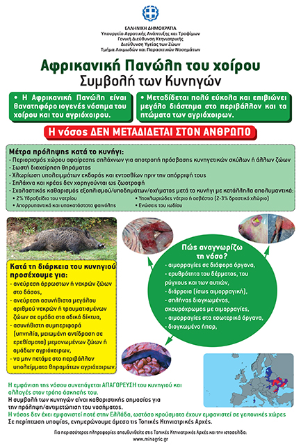 Για τον έγκαιρο εντοπισμό του νοσήματος σε περίπτωση εισόδου στη χώρα παρακαλούμε για την αυξημένη επαγρύπνηση των υπαλλήλων της Υπηρεσίας μας και των μελών των Κυνηγετικών Συλλόγων. Σε κάθε περίπτωση ανεύρεσης νεκρών ή ασθενών αγριόχοιρων απαιτείται η ενημέρωση των τοπικών Κτηνιατρικών Υπηρεσιών.