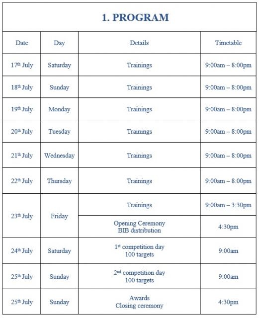 Παρακάτω παραθέτουμε στον πίνακα τις ημέρες που θα είναι ανοιχτό το σκοπευτήριο για προπονήσεις καθώς και τις διαθέσιμες ώρες.