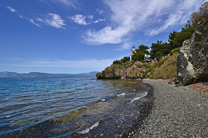 Τα ψηλά πεύκα σε συνδυασμό με τα γαλαζοπράσινα νερά του Ευβοϊκού δίνουν υπέροχους χρωματισμούς όλες τις εποχές.
