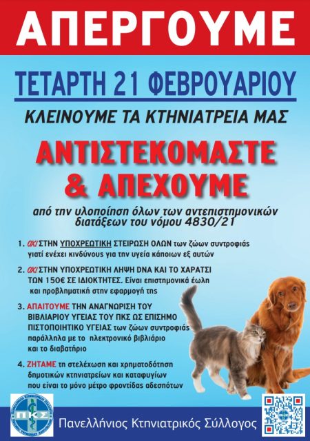 Παράλληλα, στο ίδιο πλευρό, τάσσονται και οι κτηνιατρικοί σύλλογοι σε ολόκληρη τη χώρα. Ο Πανελλήνιος Κτηνιατρικός Σύλλογος προκήρυξε νέα απεργιακή κινητοποίηση για την Τετάρτη 21 Φεβρουαρίου, αντιτασσόμενος στο νέο νομοσχέδιο που φέρει «αντεπιστημονικές διατάξεις».