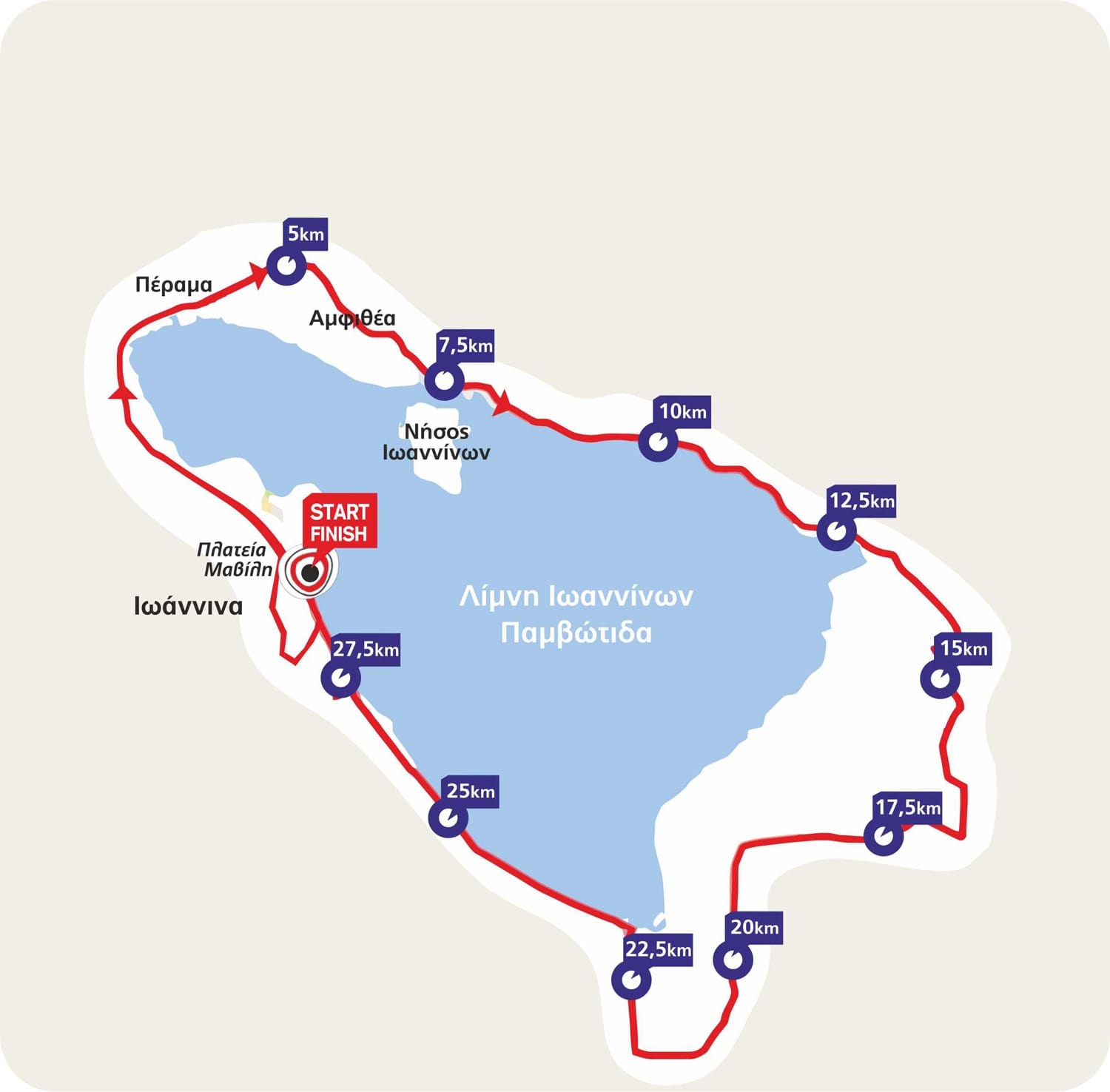 Αγώνας δρόμου 30 χλμ. σε άσφαλτο. Μία επίπεδη διαδρομή δίπλα στη λίμνη Παμβώτιδα και μέσα στη φύση. Μία διαδρομή εξαιρετικής σπανιότητας, κατάλληλη για αρχάριους και ιδανική για έμπειρους δρομείς.