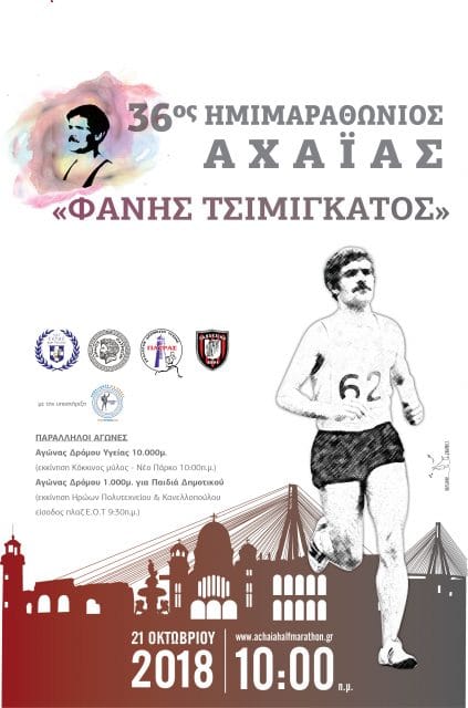 Η Ε.Α.Σ. Σ.Ε.Γ.Α.Σ. Βόρειας Πελοποννήσου σε συνεργασία με τον Δήμο Πατρέων, το Σύλλογο Δρομέων Υγείας Πάτρας (Σ.Δ.Υ.Πάτρας) και την Παναχαϊκή Γυμναστική Ένωση, διοργανώνουν τον Αγώνα σε Δημόσιο Δρόμο με την επωνυμία, 36ος Ημιμαραθώνιος Δρόμος Αχαΐας «ΦΑΝΗΣ ΤΣΙΜΙΓΚΑΤΟΣ» που είναι αφιερωμένος στη μνήμη του Πατρινού αθλητή – Μαραθωνοδρόμου Φάνη Τσιμιγκάτου.