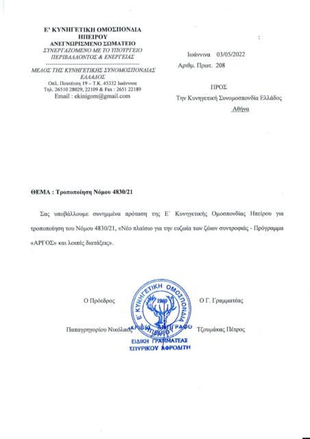 Με αφορμή την κατάθεση τροπολογίας από το Υπουργείο Εσωτερικών που αφορά Ρυθμίσεις για την ευζωία των ζώων (Νόμος 4830/2021), σας ενημερώνουμε ότι στις 19 Μαΐου 2022, πραγματοποιήθηκε συνάντηση εργασίας με τον υφυπουργό Εσωτερικών κ. Στέλιο Πέτσα και αντιπροσωπίας της Ε΄ Κυνηγετικής Ομοσπονδίας Ηπείρου και της Κυνηγετικής Συνομοσπονδίας Ελλάδος.