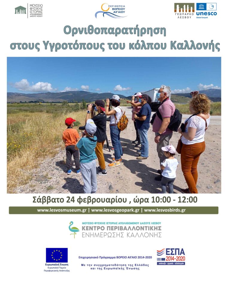 Χειμερινές εξορμήσεις ορνιθοπαρατήρησης διοργανώνουν το Μουσείο Φυσικής Ιστορίας Απολιθωμένου Δάσους Λέσβου – Κέντρο Περιβαλλοντικής Ενημέρωσης Καλλονής, με σκοπό την ευαισθητοποίηση και γνωριμία των κατοίκων και των επισκεπτών για τους υγροτόπους και τους χειμερινούς φτερωτούς επισκέπτες της Λέσβου που έχει αναγνωρισθεί ως Παγκόσμιο Γεωπάρκο UNESCO.