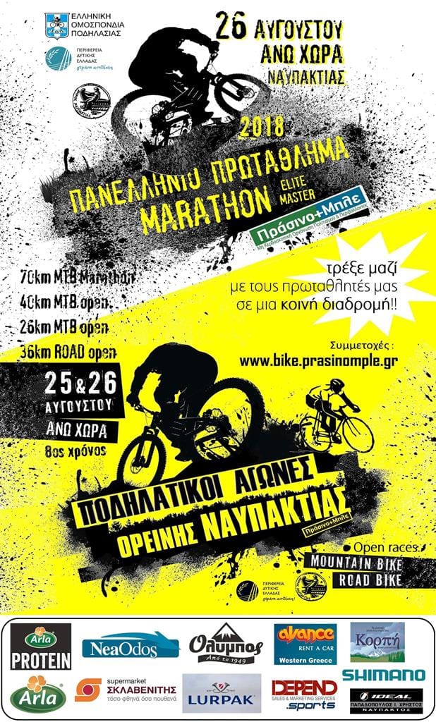 Η περιβαλλοντική οργάνωση Πράσινο+Μπλέ συν διοργανώνει μαζί με τον Δήμο Ναυπακτίας, την περιφέρεια Δυτικής Ελλάδας και την Ελληνική Ομοσπονδία Ποδηλασίας ΕΟΠ το Πανελλήνιο Πρωτάθλημα Marathon 2018.