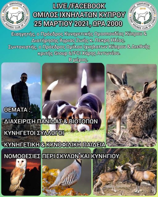 Μαζί μάς θα είναι ο Πρόεδρος της Κυνηγετικής Ομοσπονδίας Κύπρου και Διατήρησης Άγριας Ζωής, κ. Πεκρης Ηλίας για να μας ενημερώσει για τα διάφορα τρέχων θέματα που αφορούν το κυνήγι, τους σκύλους, Νομοθεσίες, την Διαχείριση θηραμάτων /βιότοπων/επιβλαβή θηράματα, για τους Κυνηγετικούς Συλλόγους και για άλλα θέματα που απασχολούν τους Κυπρίους κυνηγούς.